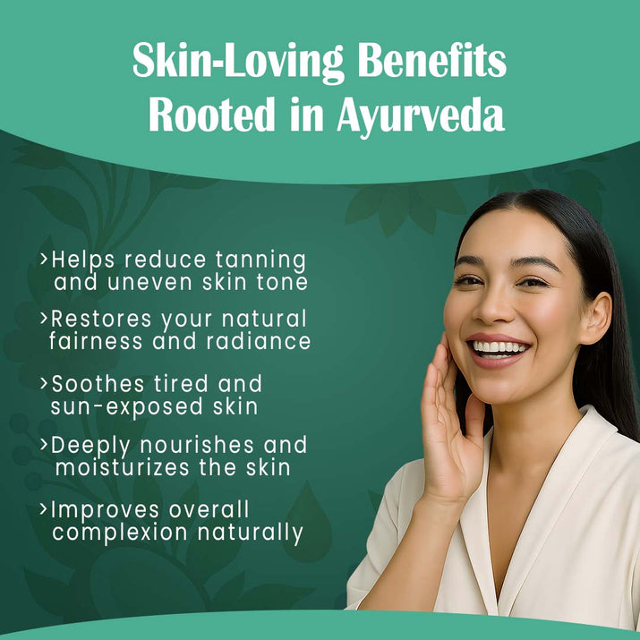 This oil effectively addresses stubborn tan lines, dark spots, and uneven skin tone. Whether you're dealing with sun damage or dullness, the blend of Ayurvedic ingredients works to restore your skin’s natural radiance and vitality.